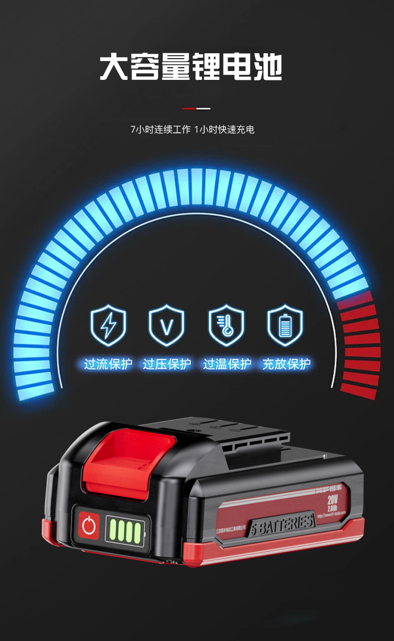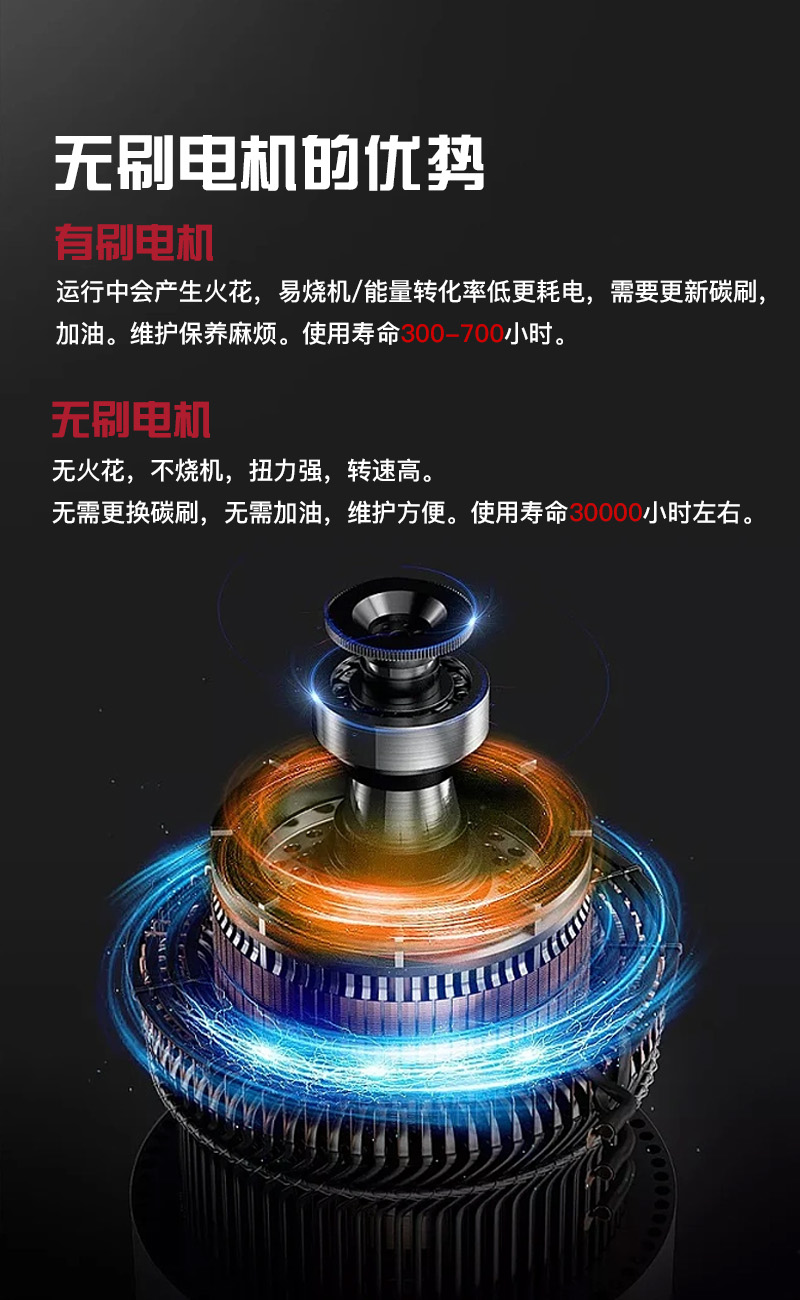 锂电无刷:无火花,不烧机,扭力强,转速高。无需更换碳刷,无需加油,维护方便。使用寿命20000小时左右。